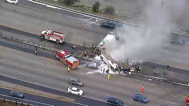 SoCal storm: Semi hydroplanes on 10 Fwy in Colton