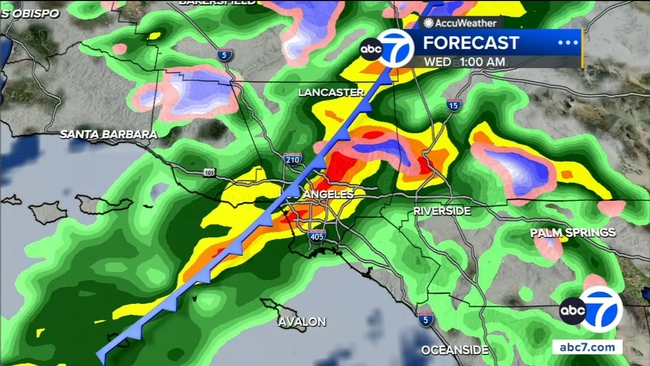 The second round of storms this week will begin moving into our region around midnight and is forecasted to be right above downtown L.A. around 1 a.m. Wednesday.