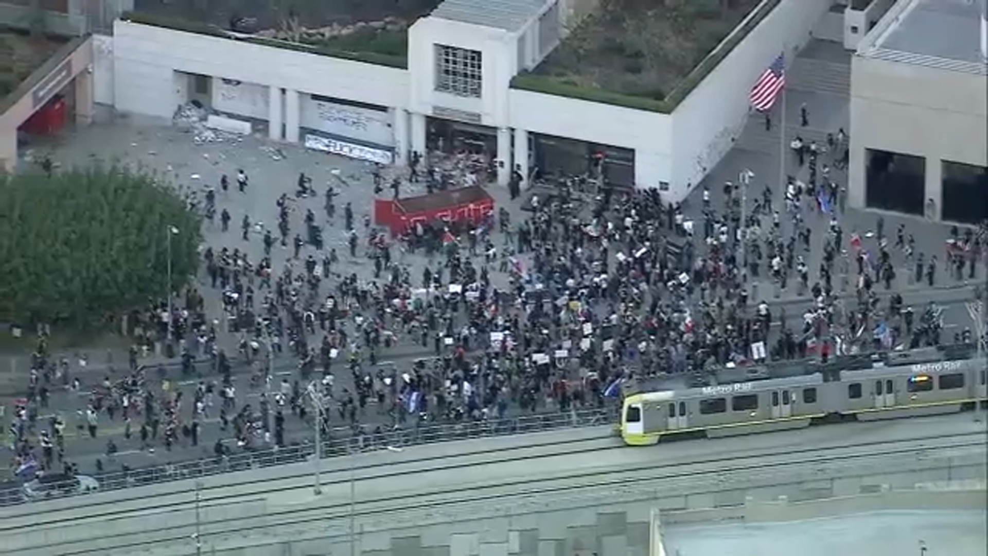 DOWNTOWN, LOS ANGELES (KABC) -- Two protests in downtown Los Angeles on Friday and Saturday were overall peaceful before the night fell, and smaller groups of demonstrators faced off with law enforcement.