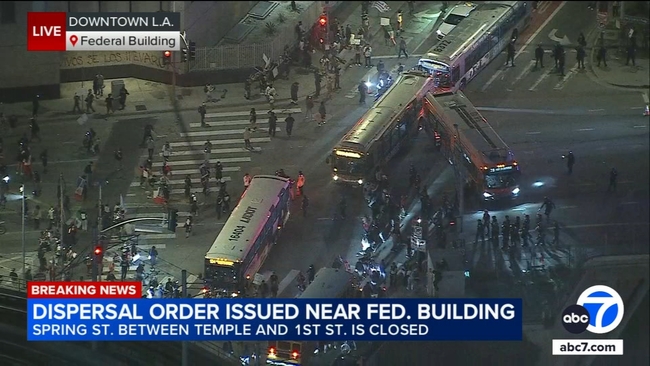 Los Angeles police have issued a dispersal order near the federal building as protesters face off with officers in downtown L.A. following Friday's "ICE Out" demonstration.