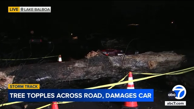 Massive tree topples in Lake Balboa amid storm, crushing car