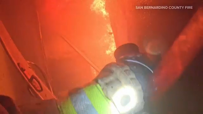 Body camera video from a San Bernardino County firefighter shows the large fire. At one point, electrical lines fell onto a metal fence near the house.