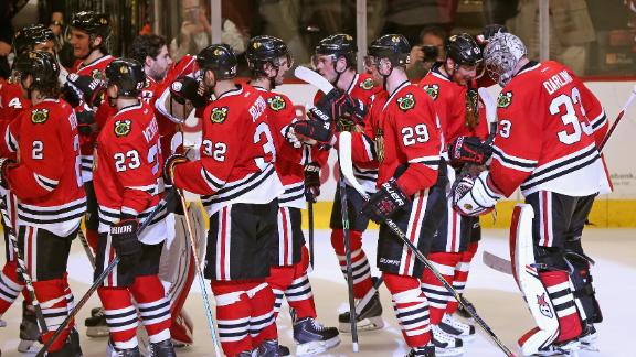 Keith's power-play goal on a knee-high drive through a screen from the top of the slot made it 2-1 at 1:37. Moments after Patrick Sharp's shot glanced off the crossbar, Hjalmarsson pounced on a failed clearing attempt for the Kings and ripped a rising shot past Quick's glove at 2:41 for his 100th NHL point.