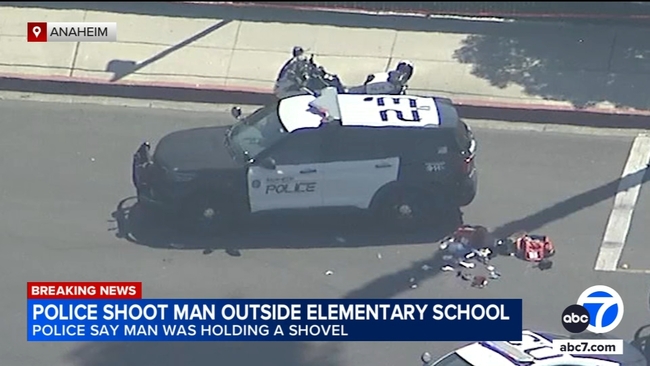 ANAHEIM, Calif. (KABC) -- Newly released body camera video shows police fatally shooting a man who authorities said brandished a shovel in a confrontation last month near an Anaheim elementary school.