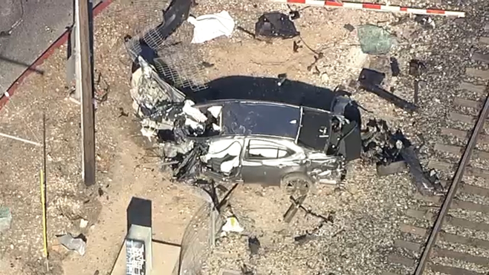 Seconds later, the train smashed into the trailer, sending debris flying.