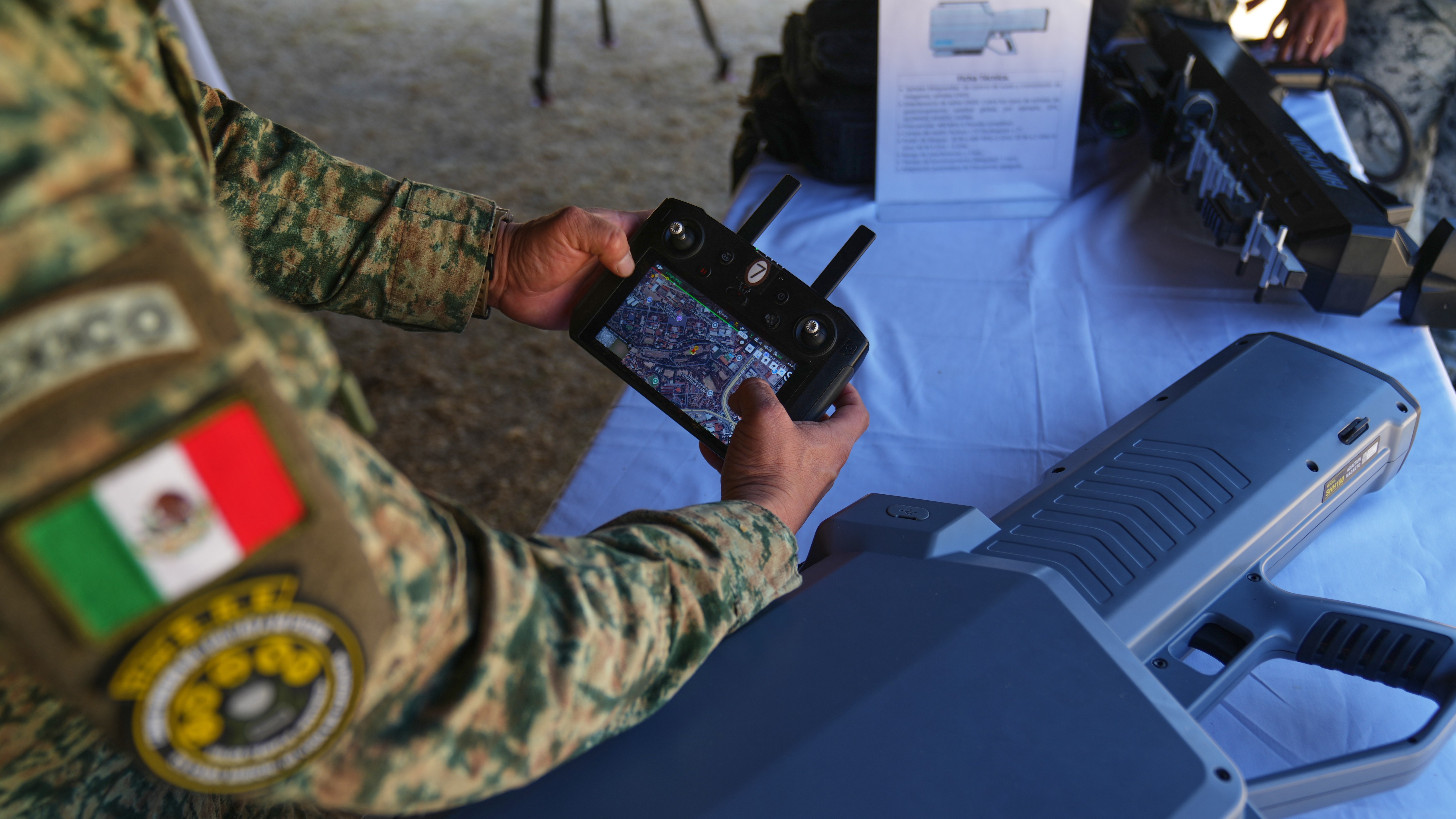 En los espacios del Batallón de Respuesta a Emergencia de la Secretaría de la Defensa Nacional, en el Campo Militar número 1 de la zona metropolitana de la capital, un grupo de uniformados realizó el viernes una exhibición de los equipos portátiles y semifijos de inhibición de drones que se emplearán en los diferentes festivales y en los estadios Banorte (antes conocido como Estadio Azteca) de Ciudad de México, Akron de Guadalajara y BBVA de Monterrey.