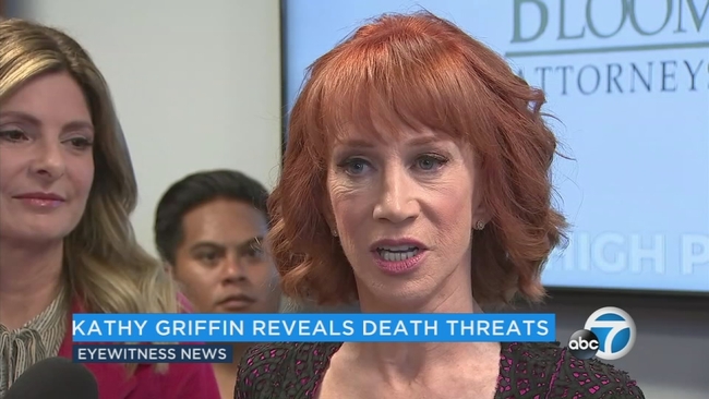 WOODLAND HILLS, LOS ANGELES -- Embattled comedian Kathy Griffin says she's not afraid of Donald Trump and plans to keep making fun of him but maintained that she's sorry for a video that depicted her holding a likeness of the president's severed, bloody head.