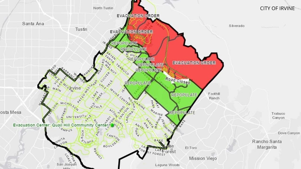 The smoky fire has exploded in size to 13,354 acres after breaking out at 6:47 a.m. Monday in the area of Santiago Canyon Road and Silverado Canyon Road. Strong gusts pushed flames along brushy ridges in Silverado Canyon and near houses in the sprawling city of Irvine, home to about 280,000 residents. By Tuesday, the blaze was 5% contained.