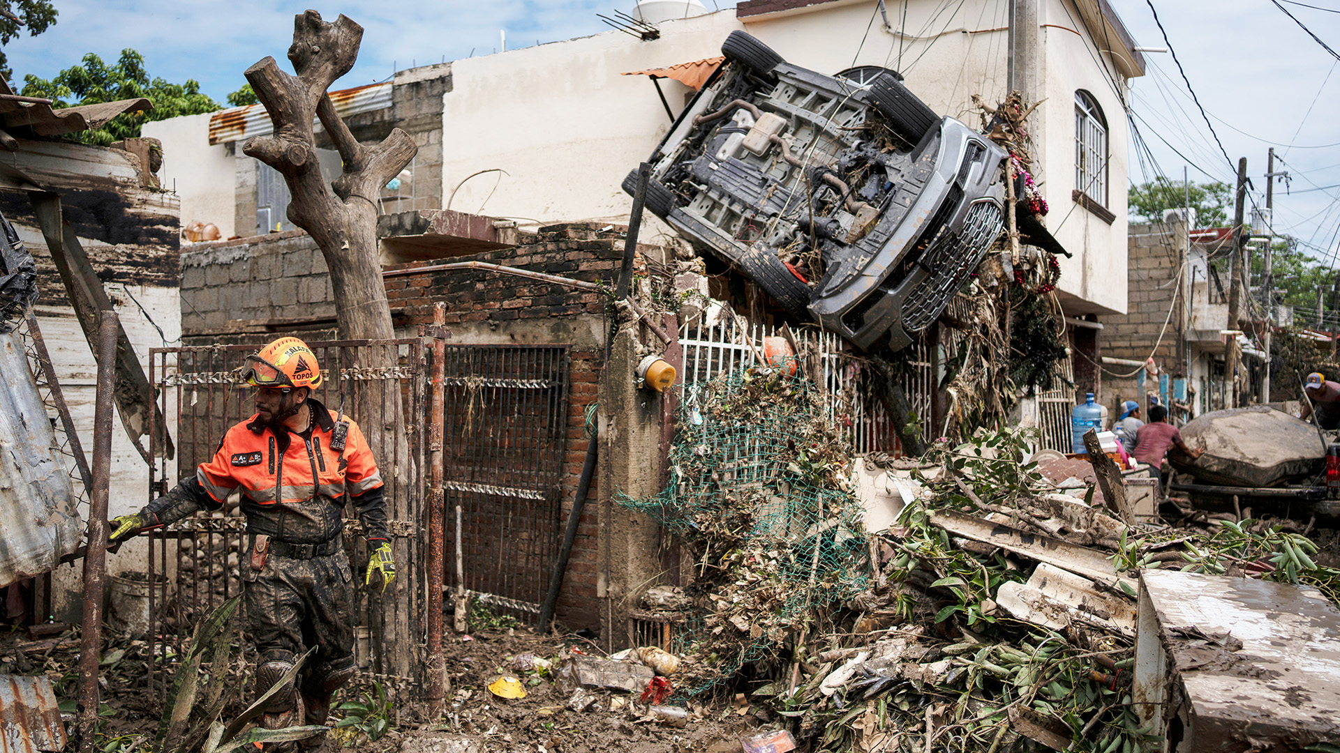 En algunas calles de Poza Rica, la situación se complicaba porque al lodo y los escombros se sumaba una pasta negruzca que manchaba árboles y techos de lámina, junto a vehículos que habían sido arrastrados por la inundación hasta tejados cercanos.