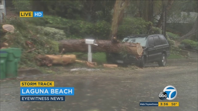 LAGUNA BEACH, Calif. (KABC) -- As Friday's massive storm moved into the Orange County area, the powerful winds and rain brought down trees crashing onto cars and homes, in addition to flooding streets and creating other hazards throughout the region.