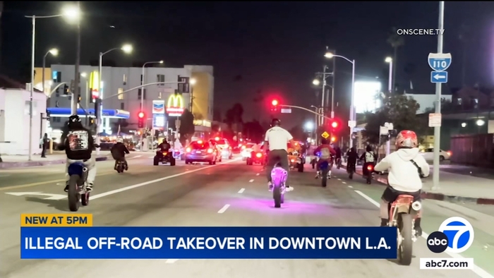 A group of riders on off-road motorcycles and ATVs made their way through downtown Los Angeles during a late-night street takeover.
