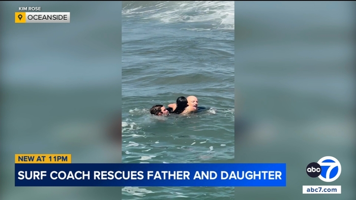 A surfing coach sprung into action after spotting a father and daughter struggling in a rip current in Oceanside.