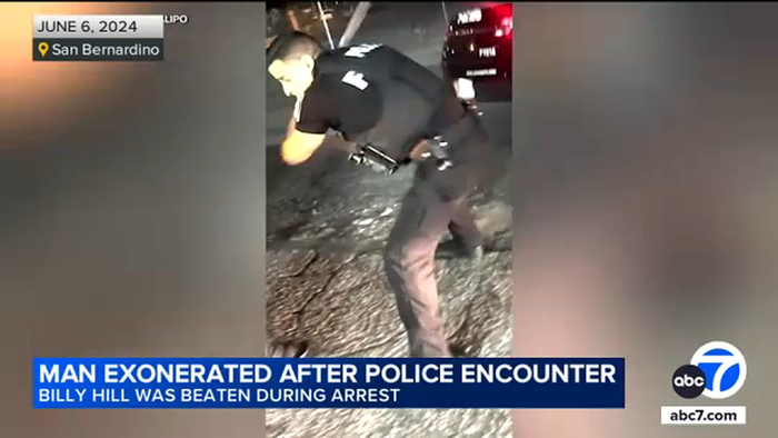 A Crestline man who was beaten by a San Bernardino police officer has been exonerated of two serious charges.