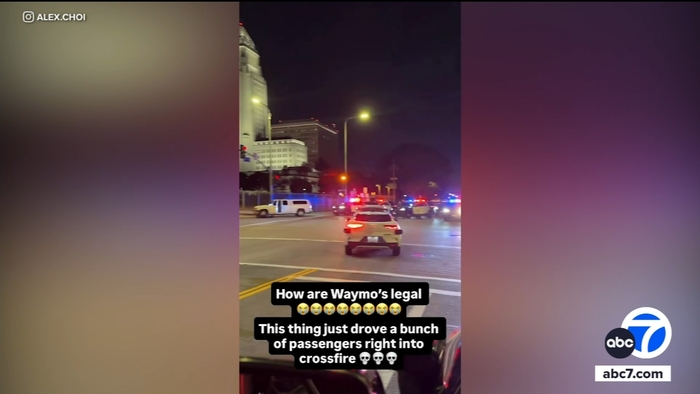 Video captured a Waymo self-driving taxi with a passenger inside drive through an active police scene with officers' guns drawn in downtown Los Angeles.